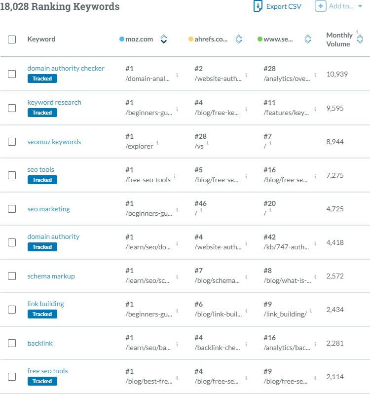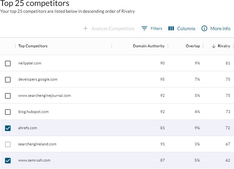 That’s where Rivalry comes in. Rivalry factors in the Click-Thru Rate (CTR) and volume of overlapping keywords, the target site’s ranking (keywords where the target ranks higher are more likely to be relevant), and the proximity of the two sites’ DA scores to help you sort which competitors are the most relevant and realistic.