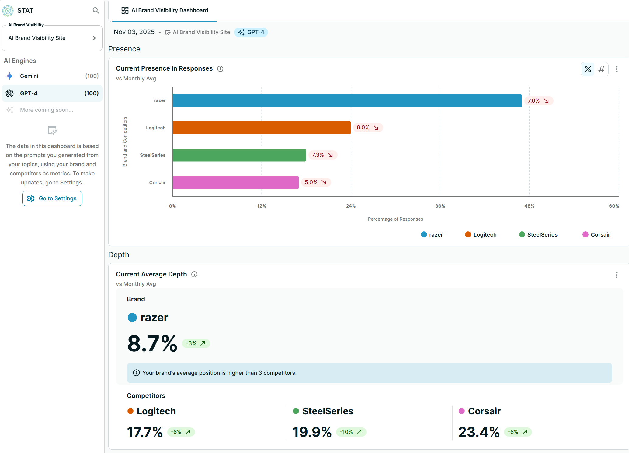 Brands can use tools like STAT's AI Brand Visibility feature to track their current presence in responses, average position relative to competitors, and performance on individual product terms