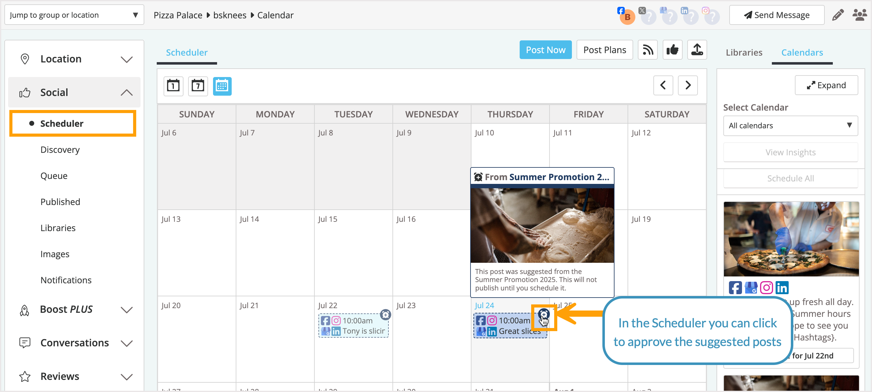 After suggesting posts for your locations, they will appear in the Scheduler view, where you can approve them to post. Click the Clock icon on the top right of the post to approve and add it to the scheduler.