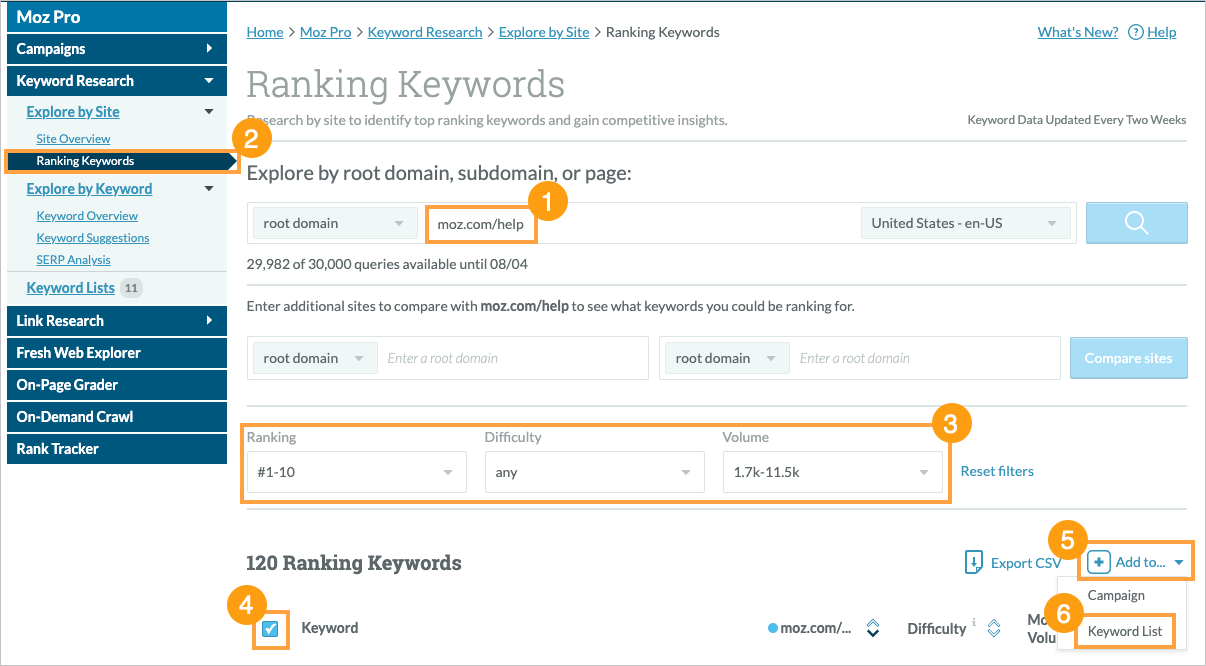 This workflow will help you to identify a benchmark Difficulty metric for your site in Keyword Explorer to help with your keyword research. If you need more information about the Difficulty metric itself, please see our keyword metrics guide.