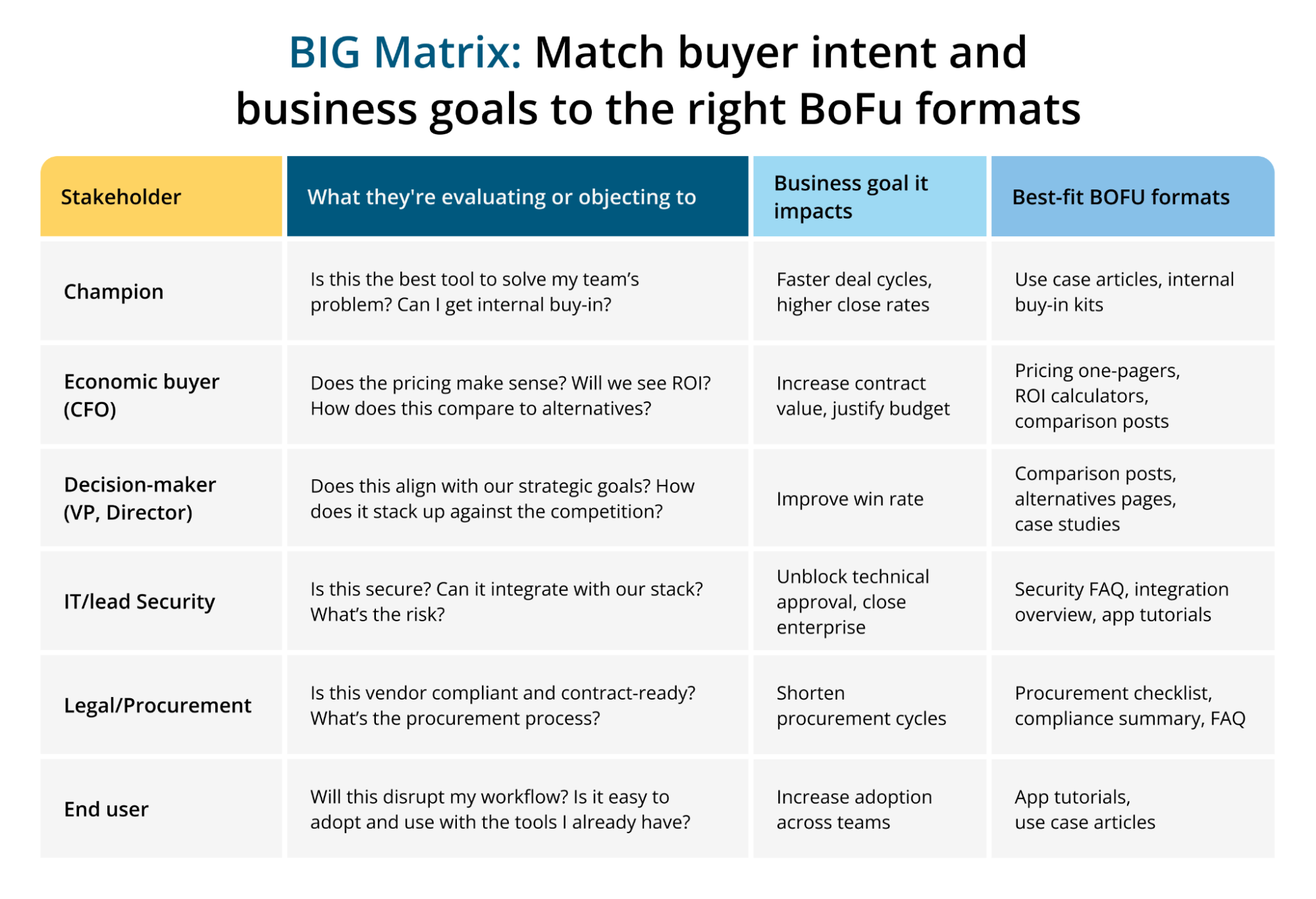 The best BoFu content gives buyers a clear reason to choose your product and advocate for it internally. Start by auditing your current content to spot gaps, then use the BIG Matrix to align formats with buyer questions and business goals.