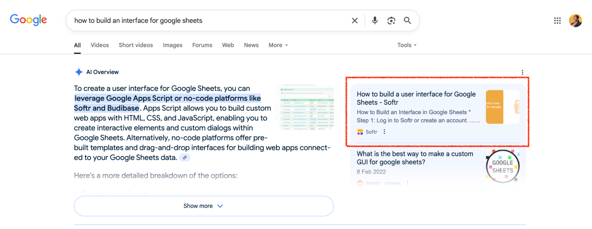 Within days of publishing, the article drove signups and ranked for high-intent keywords like “how to build an interface for Google Sheets.”