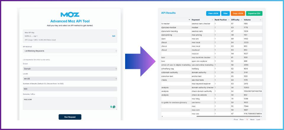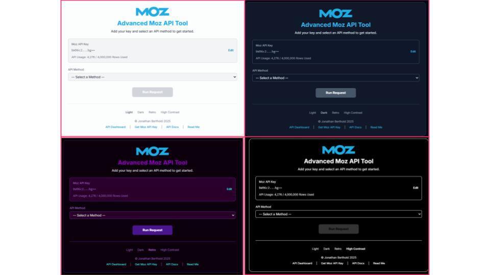 The Moz API was the anchor. Its documentation was clean, the endpoints were stable, and it gave me the flexibility to test different datasets (rankings, search intent, Brand Authority) all from one interface. Within a few hours, I had a working web app that pulled live Moz data through my API key and displayed it beautifully.