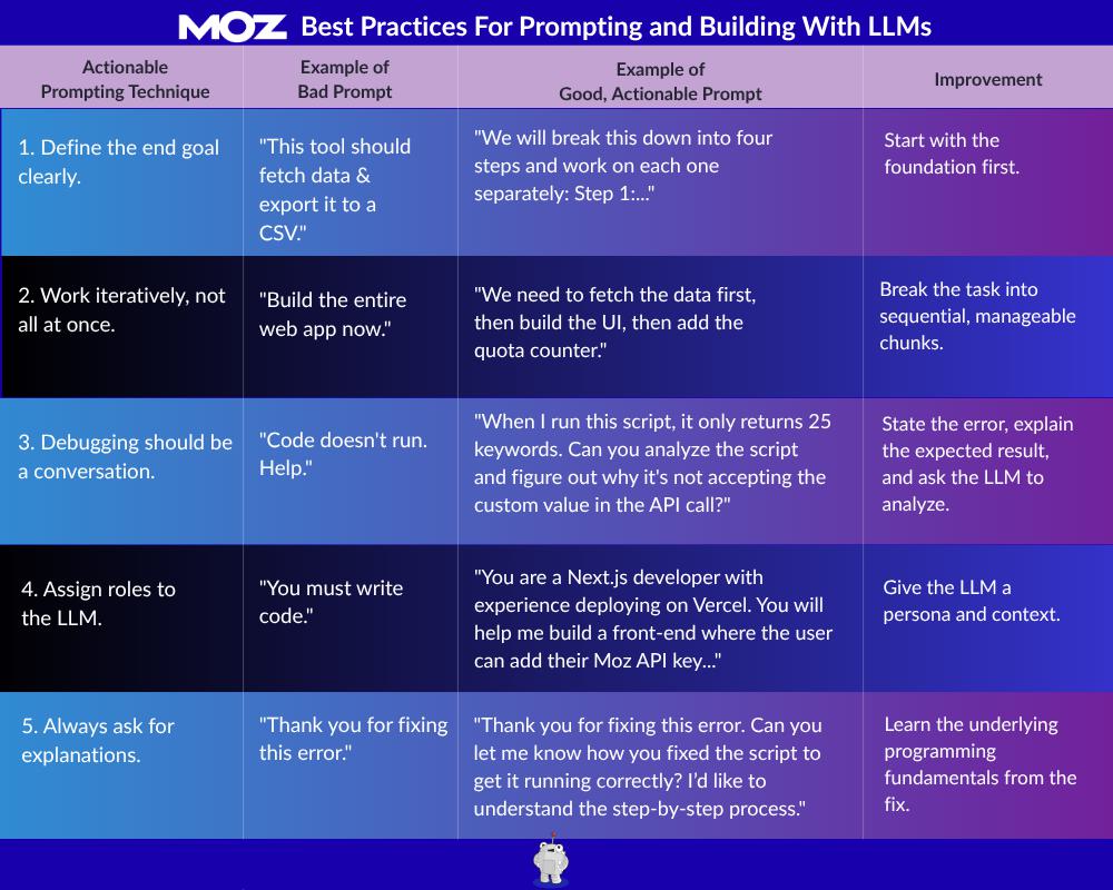 I give the LLM a specific persona and context. For example: "You are a Next.js developer with experience deploying on Vercel. Help me build a front-end where the user can add their Moz API key."