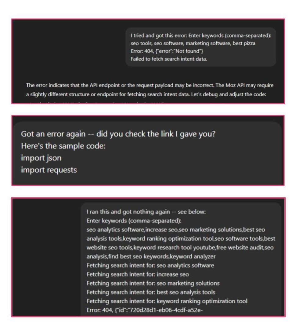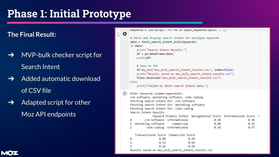 Within a few iterations, I had a working prototype that took a list of keywords, ran them through the Moz Search Intent endpoint, and exported the results as a CSV. That small script saved hours of manual work and became the foundation for everything I built after.
