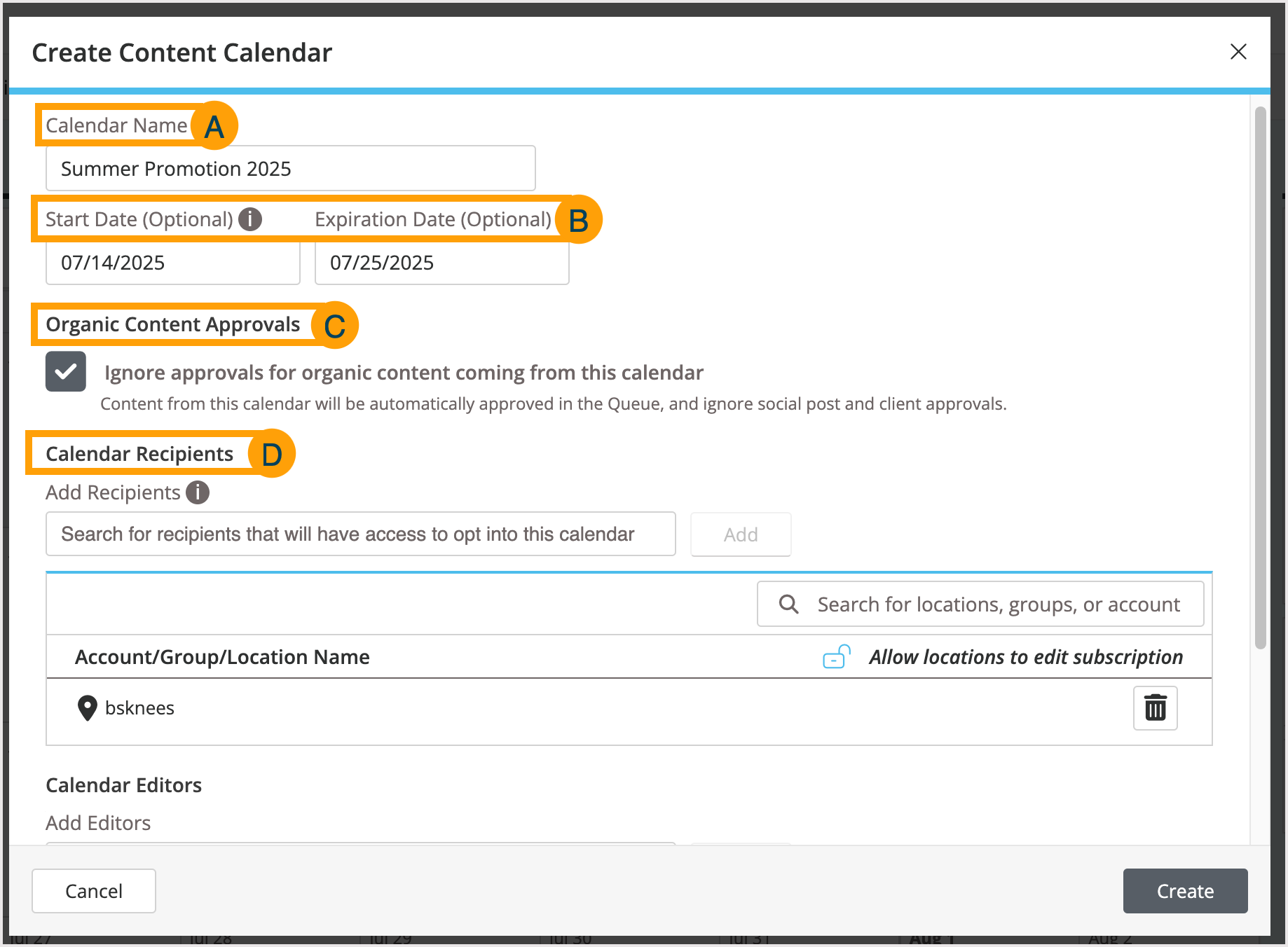- In the Create Content Calendar pop-up, fill in the information below