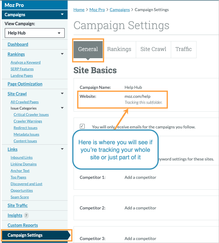 Under the Site Basics section, you should see the website you’re tracking with a note beneath it saying either Tracking all sites at this domain or Tracking this subfolder or subdomain. But what does that really mean, and what does it have to do with the error? Great question!