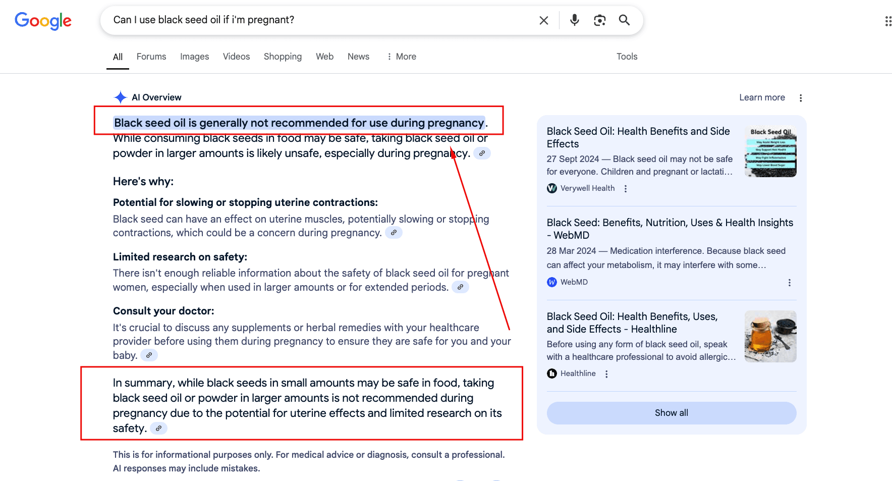 While they’ve included links to WebMD and Healthline on the right, my eyes are drawn to the answers on the left that satisfy my search intent.
