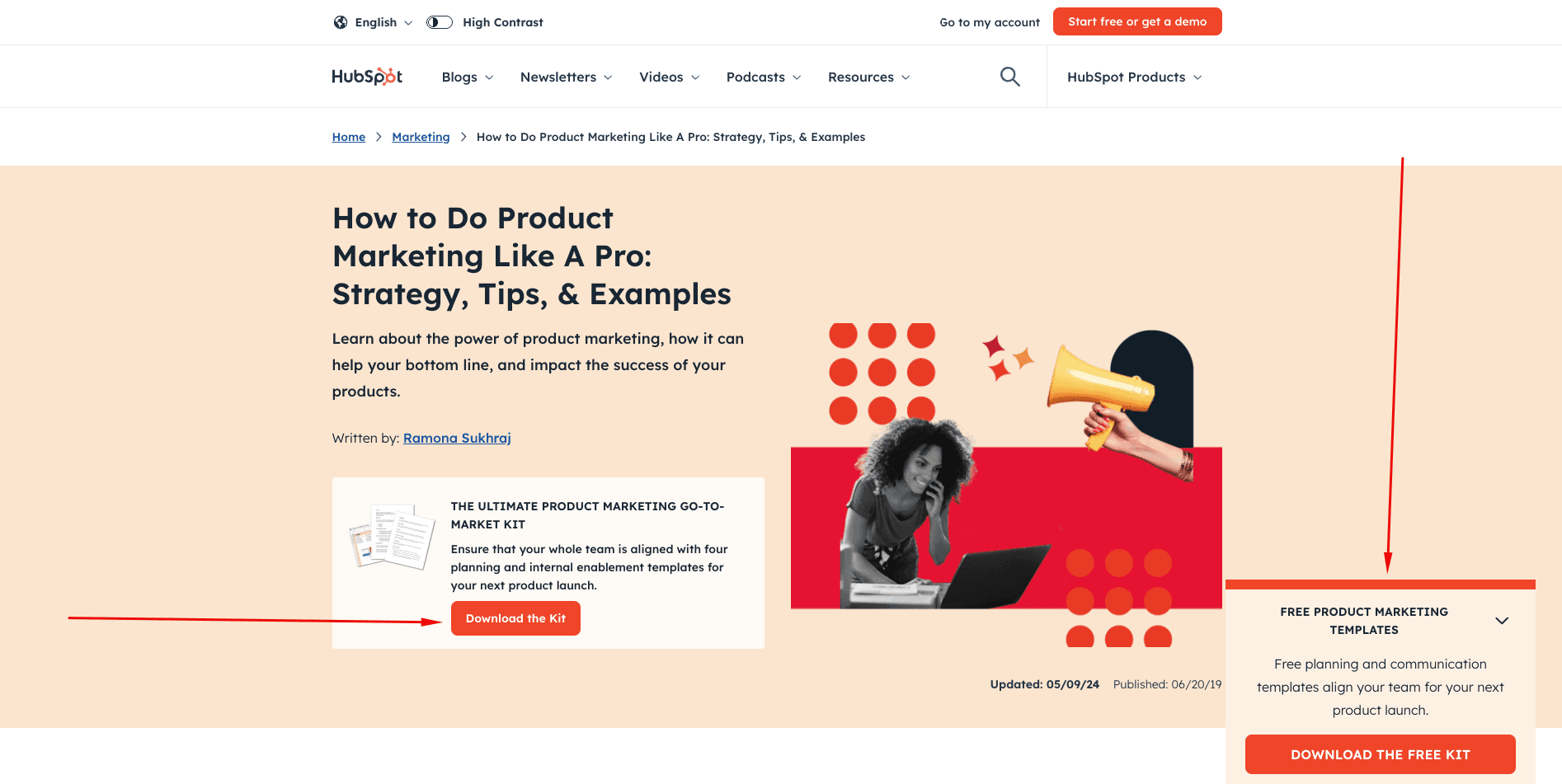 I love how HubSpot creates informational content. For example, they rank for “product marketing,” and when I clicked the link, the first thing that caught my attention was the call to action (CTA) buttons to download the product marketing kit and templates.
