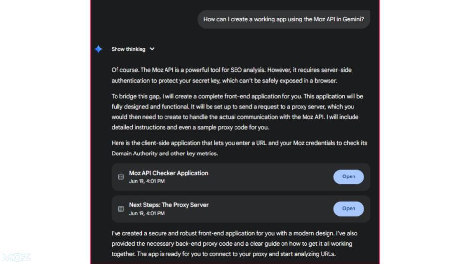 I took everything I’d already built in Sheets, fed the code into Gemini, and entered, “How can I create a working app using the Moz API in Gemini?”