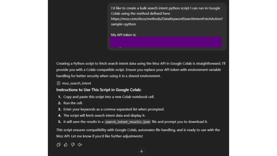 Once I had the idea, I opened Google Colab and started small. My goal was to take the Moz API and build a script that could handle bulk search intent requests instead of one at a time.