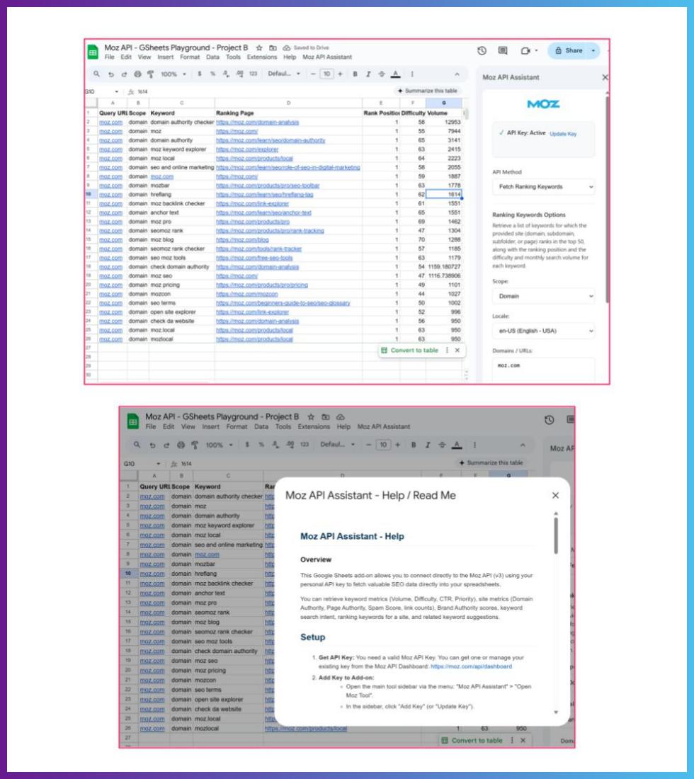By the end of the weekend, I had a working add-on. It pulled keyword metrics, saved API keys, and handled errors cleanly. The content team can use it without needing to touch the code.