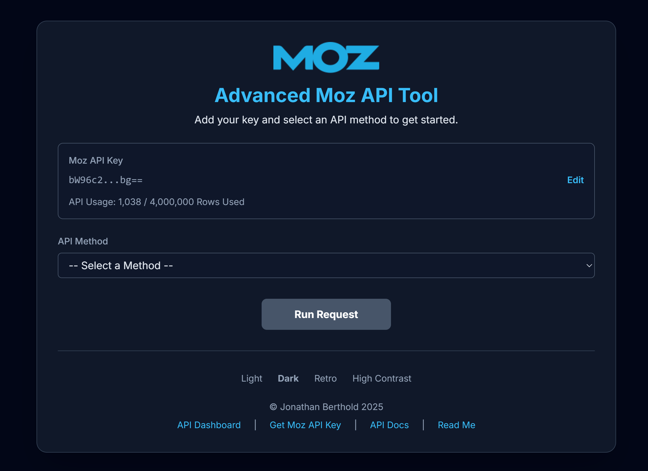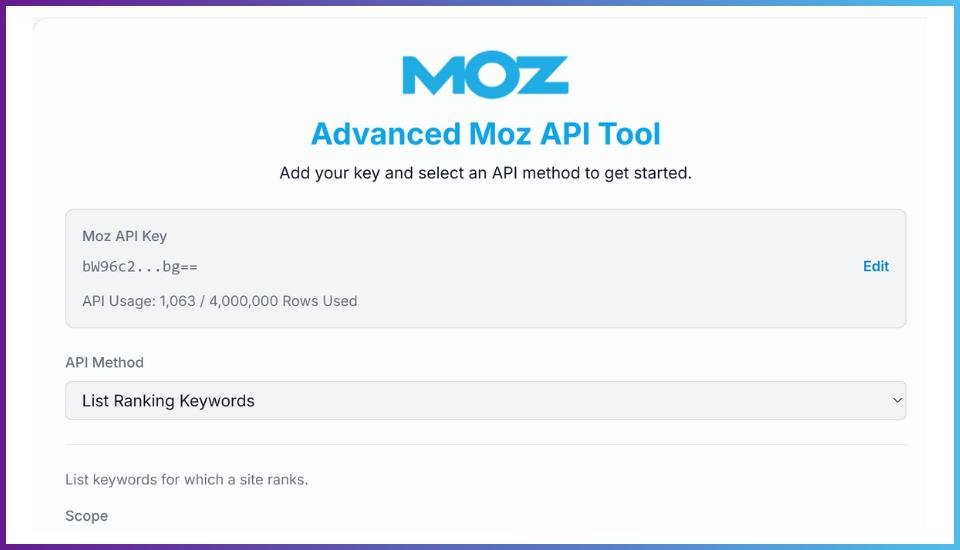The Moz API was the anchor. Its documentation was clean, the endpoints were stable, and it gave me the flexibility to test different datasets (rankings, search intent, Brand Authority) all from one interface. Within a few hours, I had a working web app that pulled live Moz data through my API key and displayed it beautifully.