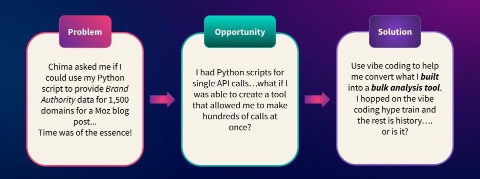 That build changed everything. The Moz API gave me the reliability to experiment fast, and vibe coding gave me the freedom to build without waiting for engineers.