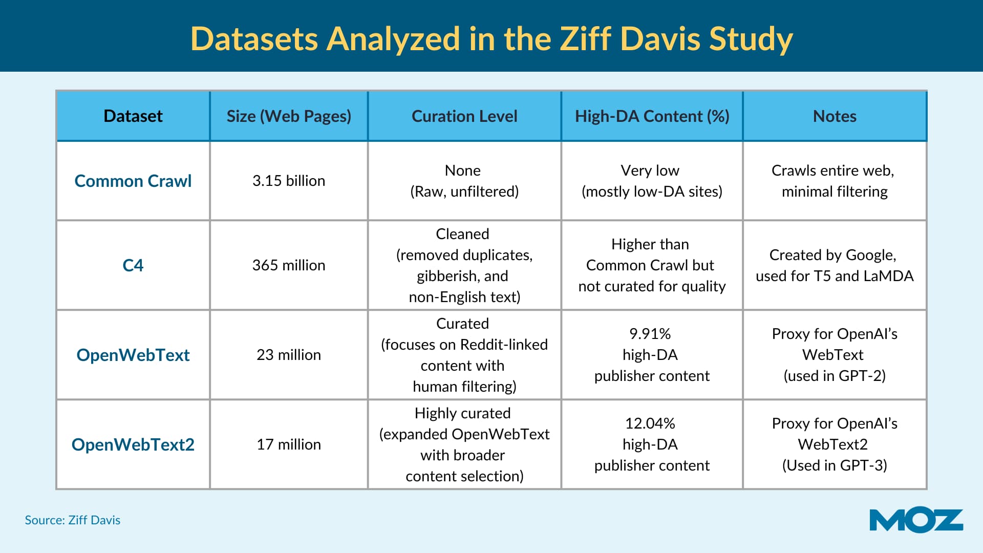 The Ziff Davis study examined four key datasets that are crucial in training large language models: