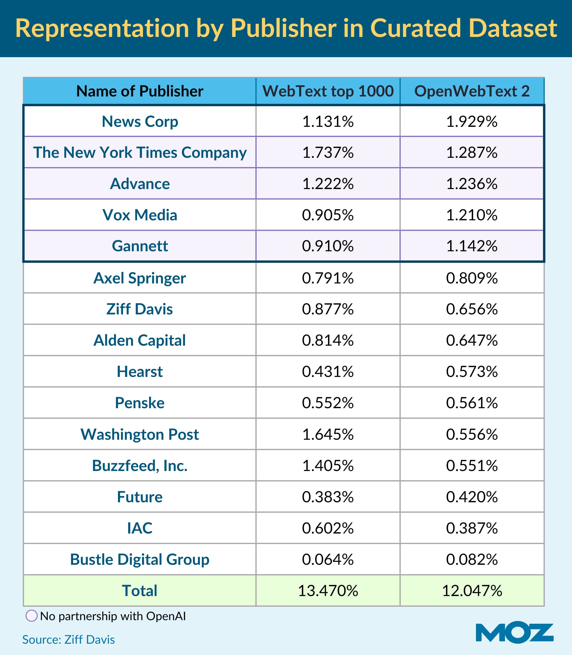 Three of the top five publishers in OpenWebText 2 (NYT, Advance, and Gannett) do not have licensing agreements with OpenAI. Also, the WebText top 1000 contains a higher percentage of these publishers than OpenWebText2 (13.47% vs. 12.04%). Suffice it to say that AI partnerships do not guarantee higher dataset representation. It’s also worth noting that the NYTimes blanket blocks almost all AI crawlers in its robots.txt, so its presence in this dataset is an indication that the makers of these datasets wanted to use NYTimes content, but not that they were able to do so.